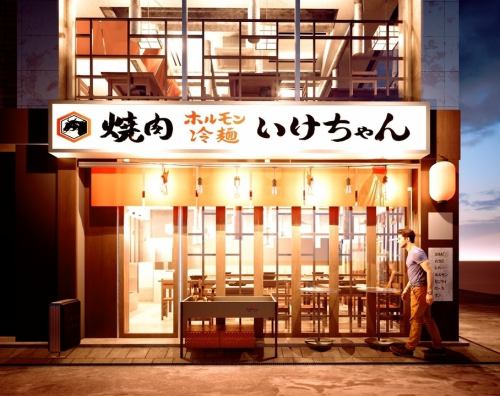 黒い文字で「いけちゃん」と書かれた大きな看板が目印です。夜になるとピカピカにライトアップされています♪ガラス張りになっているので、店内の様子を外から確認して入店することができます。初めての方でも入りやすいので、安心してご来店ください!店内の光が外にもれているので、夜は周囲が明るく照らされています!